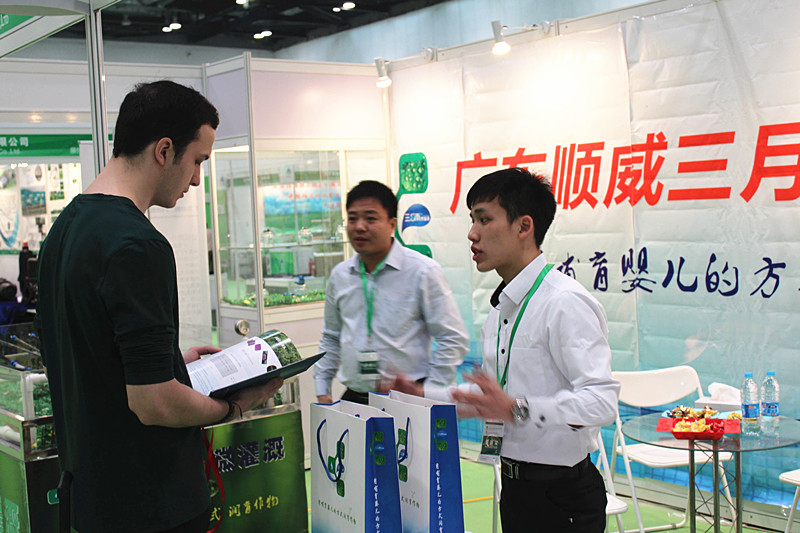 三月雨展會(huì)工作人員向外國客人介紹公司產(chǎn)品